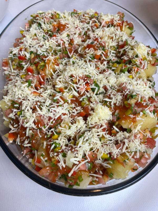 Por cima, colocar o vinagrete feito com cebola, tomate, pimentão, azeitonas, cheiro verde e temperos.